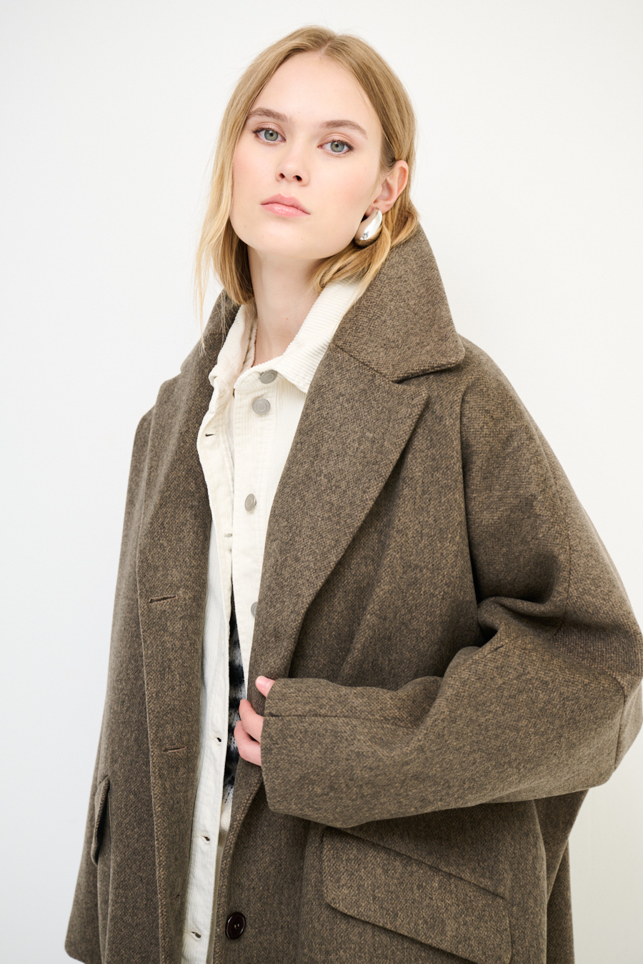 Το Lungo coat είναι σε oversized γραμμή για να σας προσφέρει άνεση και ζεστασιά. Με κουμπιά στο μπροστινό μέρος και πλα’ι’νές τσέπες.